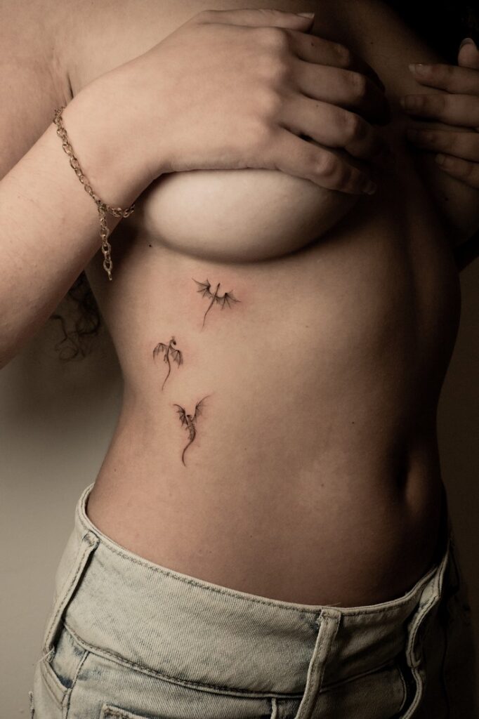 I lavori sono eleganti, intimi e a volte volutamente complessi: pensati per parlare alla persona che li porta più che a chi li osserva. Realismo e linee sottili convivono con frammenti, elementi mitologici e dettagli simbolici, trasformando ogni tatuaggio in un racconto personale.